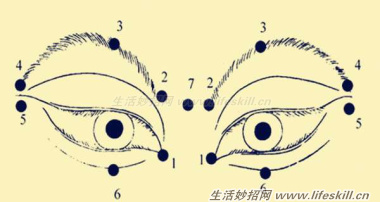 9、适时的给予眼部周围的肌肉一下按摩,跟着下面的图从1移动到6,使用中指和食指按压。当你在进行这些动作时,应该感觉到适当的压力,可是绝对不会让你感觉疼痛。