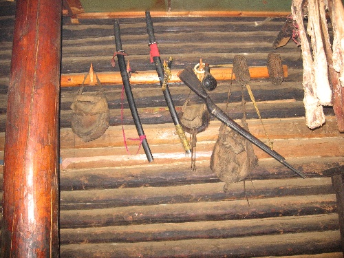 因为昨天约好了,家访一定要去阿鲁家了,他家里的祖母屋是整个泸沽湖畔最古老的,有几百年的历史了。我猜他们家的屋子应该可以“申遗”了。刚好,刺而和阿鲁家是表亲,听说摩梭是很讲究礼节的民族,我们就在集市上买了两瓶酒和一些点心作为礼物。