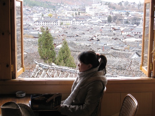 因为没有预定客栈,我们便跟着成都女孩去了她在网上预定的瓮古客栈。客栈的环境不错,老板是西安人,小院很有情调,坐落在四方街的山上,开开窗子便可观赏古城的全景,大床房100元,我和老公决定住下。