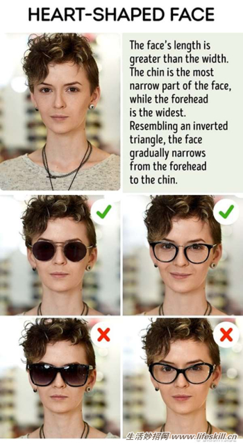 平衡脸的上下比例很重要,选择与脸部宽度相同的墨镜最合适,飞行员墨镜、无框眼镜都不错;不要选择镜框太大、颜色鲜艳的墨镜,猫眼眼镜、水滴型眼镜也不合适。